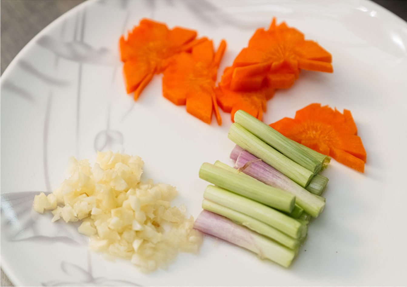下一步是处理料头,包括葱白、蒜、胡萝卜等,可以略略爆香。