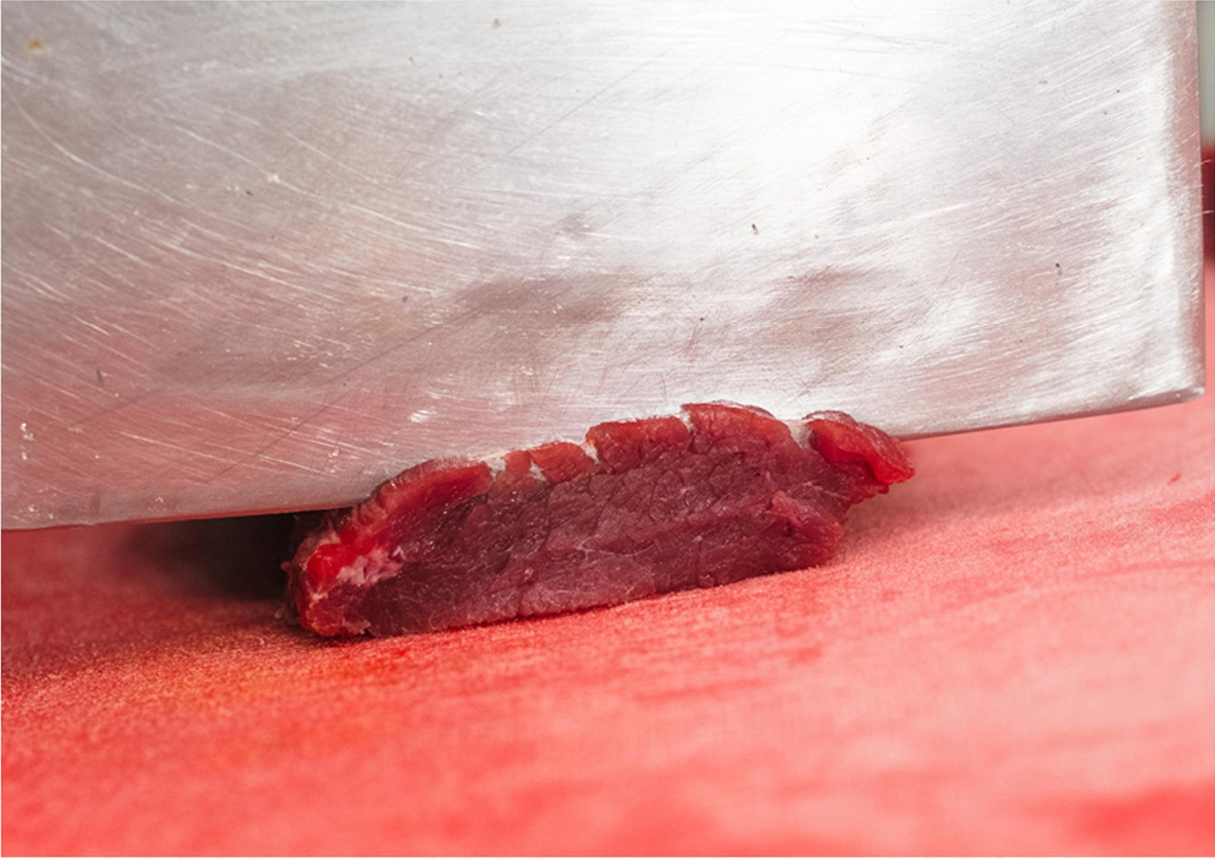 图左边的便是顺纹切的肉,肉的纤维是一条条丝那样连住,就像你吃鱿鱼丝逐条撕出来一样;而左边的则是逆纹切的肉。