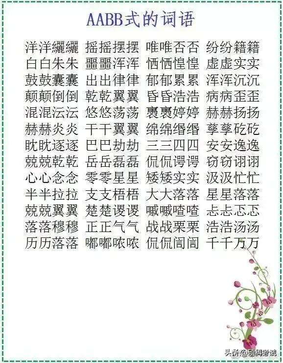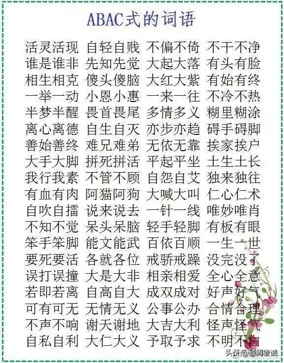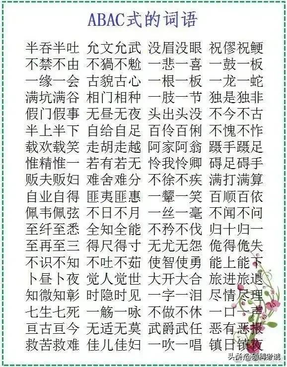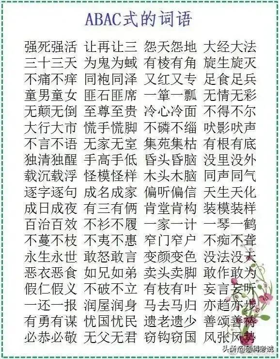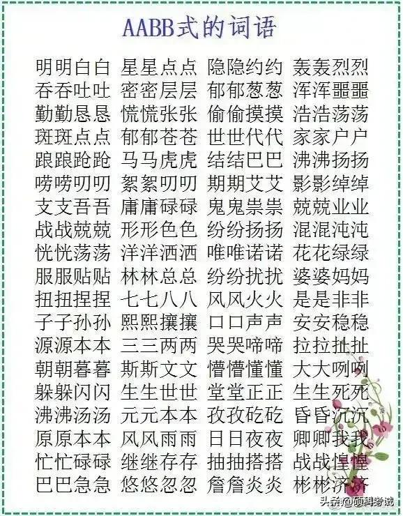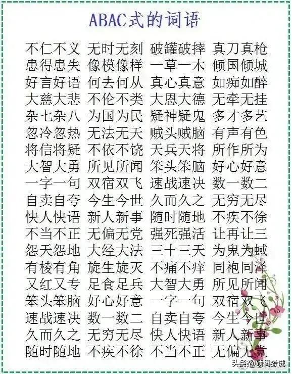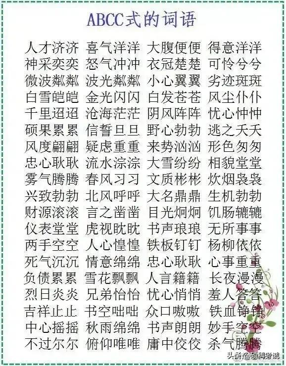 这份ABB+AABB+AABC+ABAC成语非常的齐全,家长们务必收藏起来,对于孩子积累成语有非常大的帮助。
