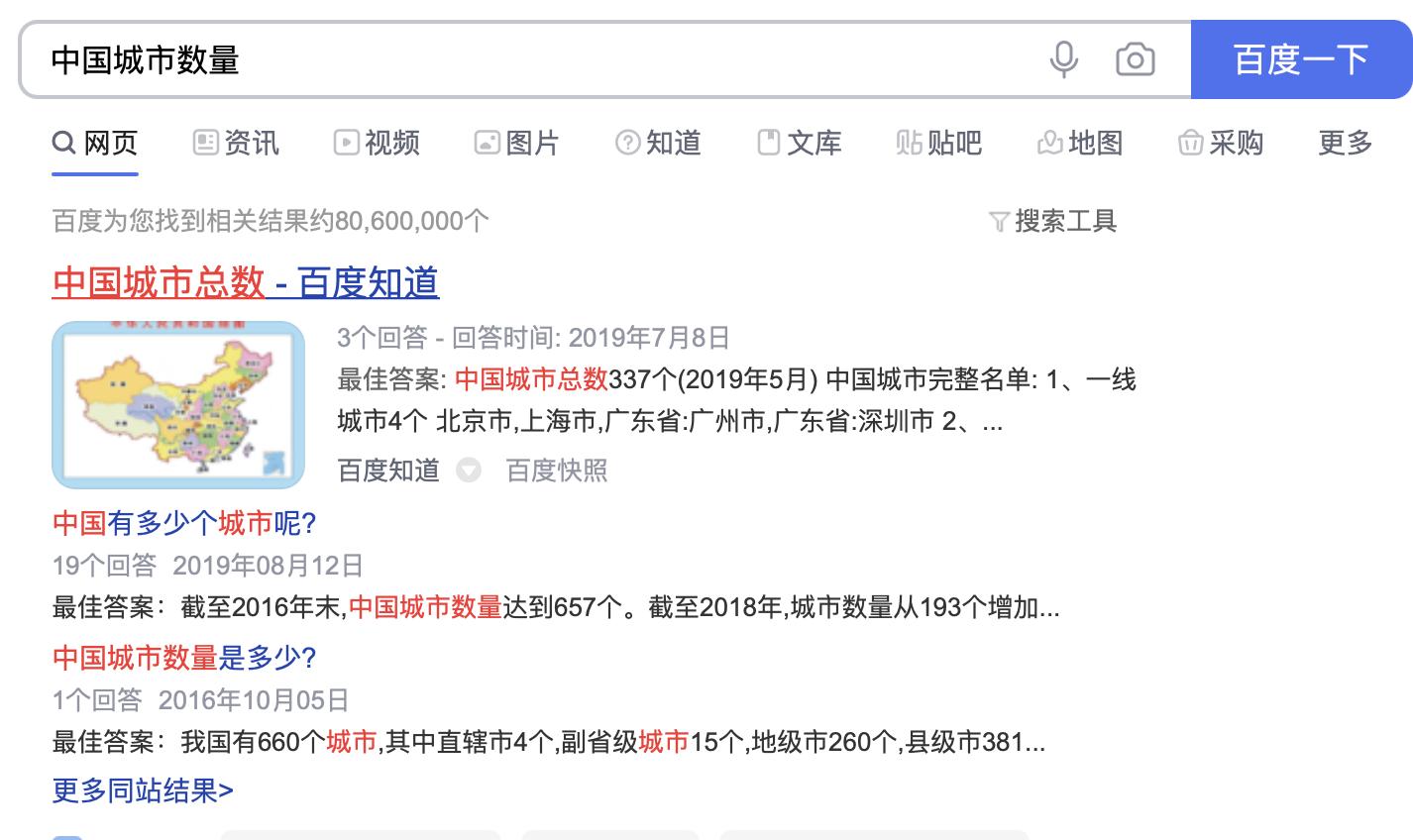 在百度搜索中国城市数量,出来的结果有多个,有660个城市的,有657个,有337个。