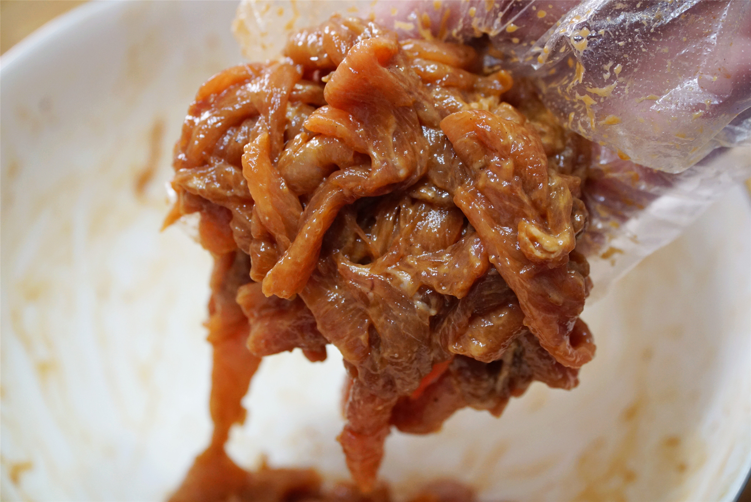 3、腌制好的肉丝中少量多次地加入清水,不断地抓匀,让肉丝吸收水分,直到肉丝中的水分看起来饱和,已经晶莹透亮,有些发黏的状态,加入1勺干淀粉,1勺油抓匀备用。