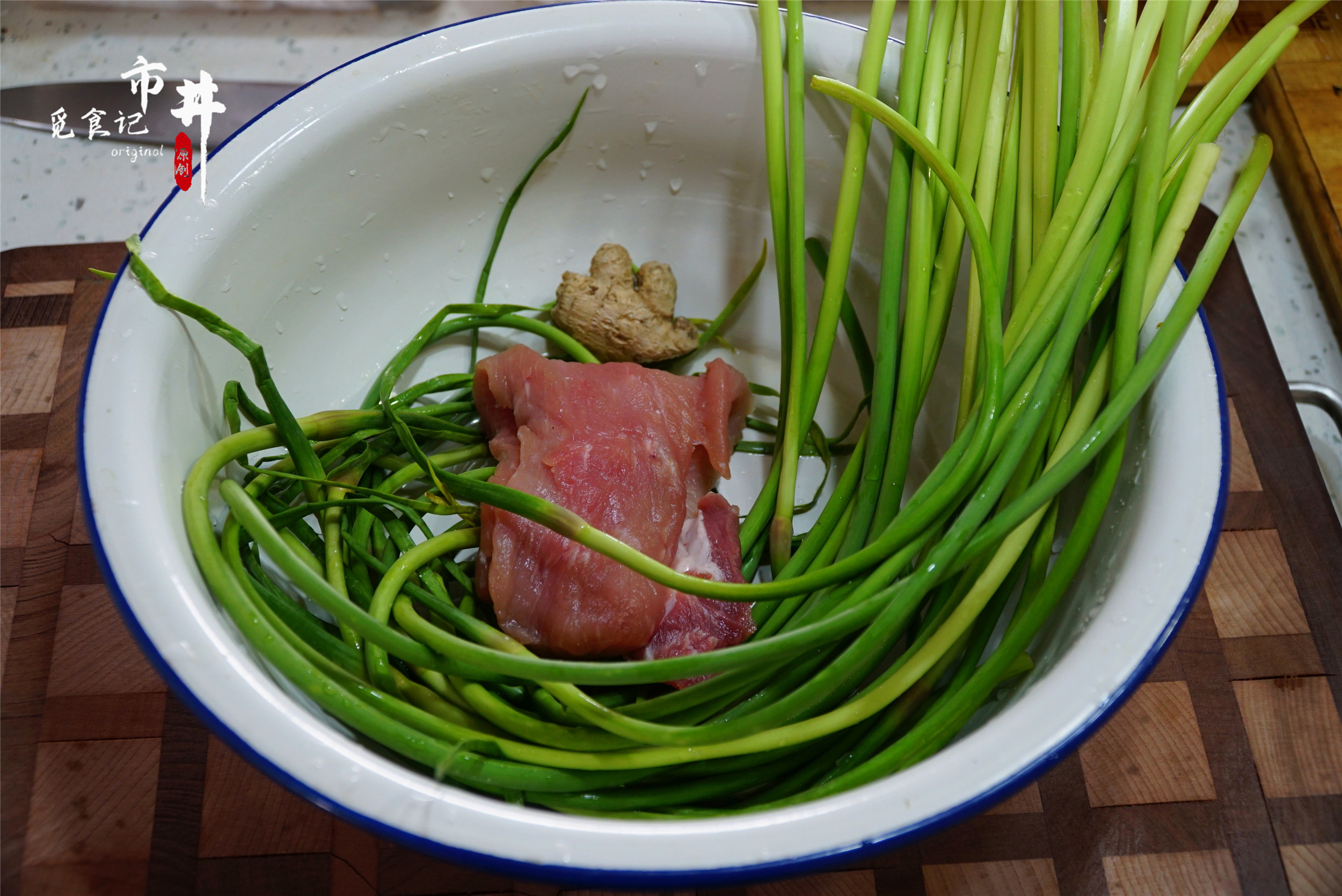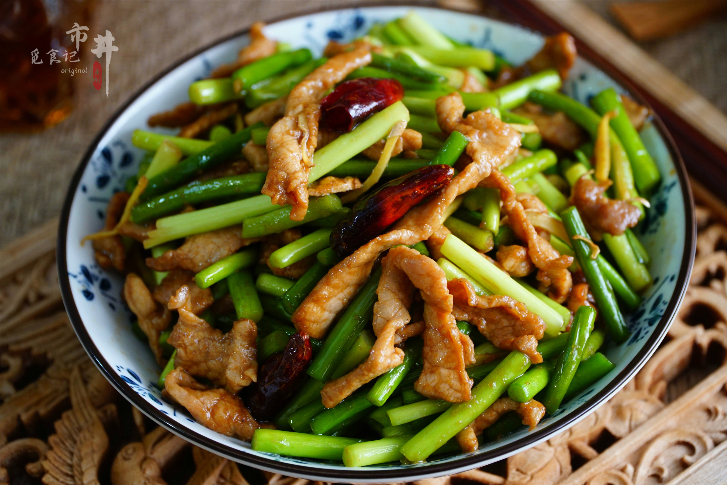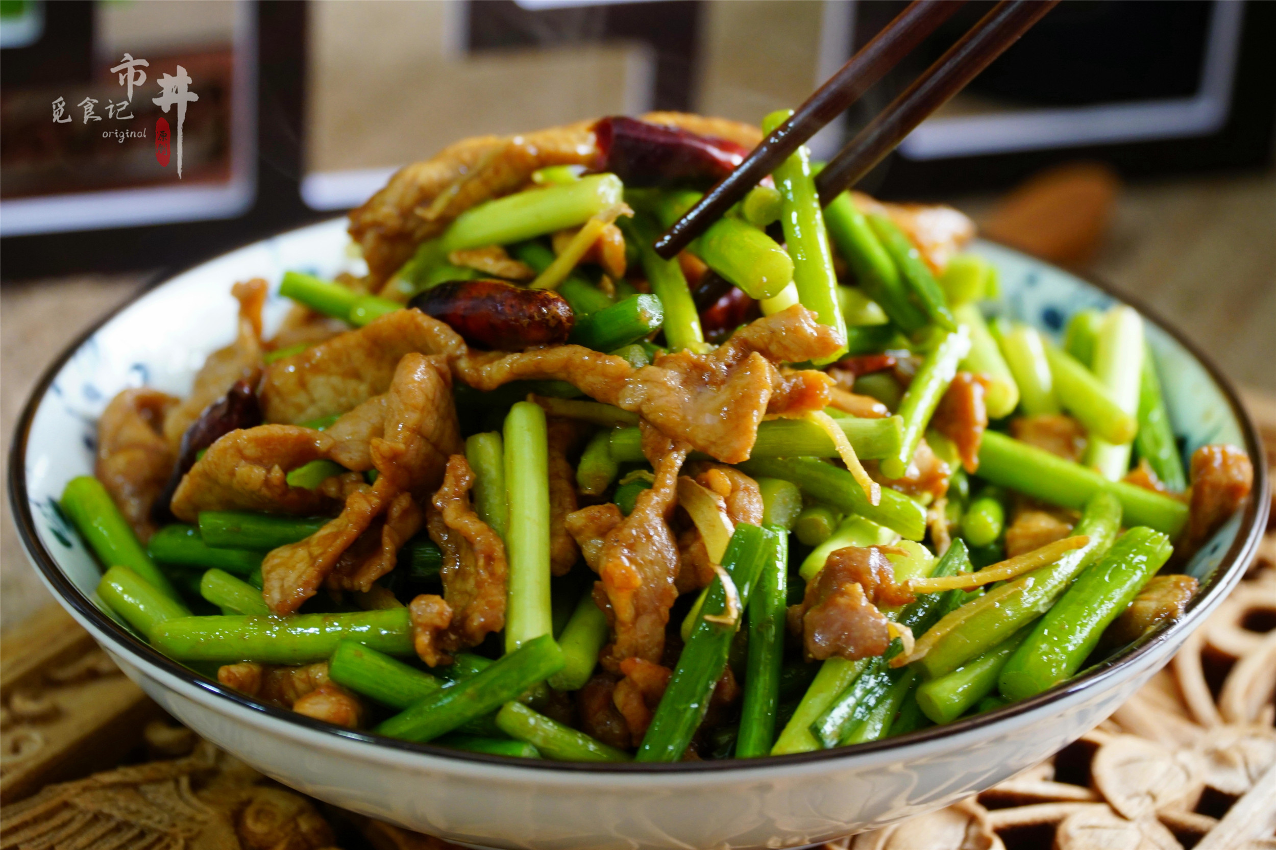 所需食材:蒜苔一把,里脊肉一块,姜、干辣椒少量;生抽、老抽、干淀粉、胡椒粉、黄酒、盐、鸡精适量。