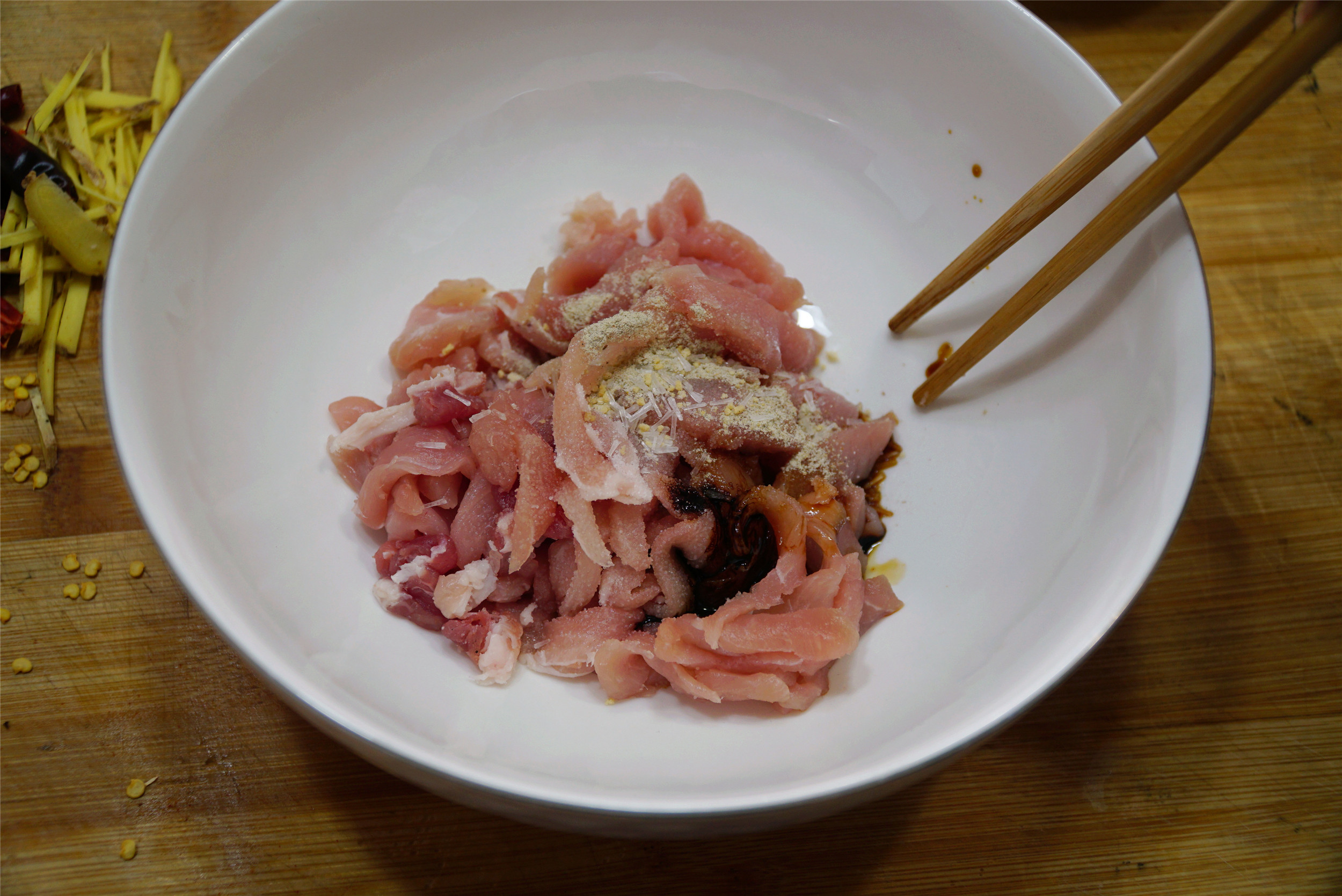 2、里脊肉丝中加入2勺生抽,半勺黄酒,适量的胡椒粉、盐、鸡精抓匀腌制5分钟。