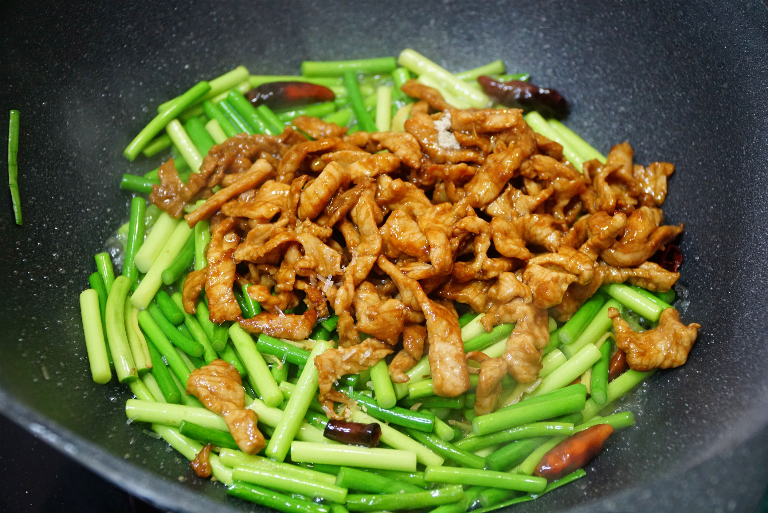 7、最后加入炒好的肉丝,大火和蒜苔一起翻炒均匀即可,可以加入适量的鸡精进行调味,一盘好吃又好看的蒜苔炒肉丝就做好了。