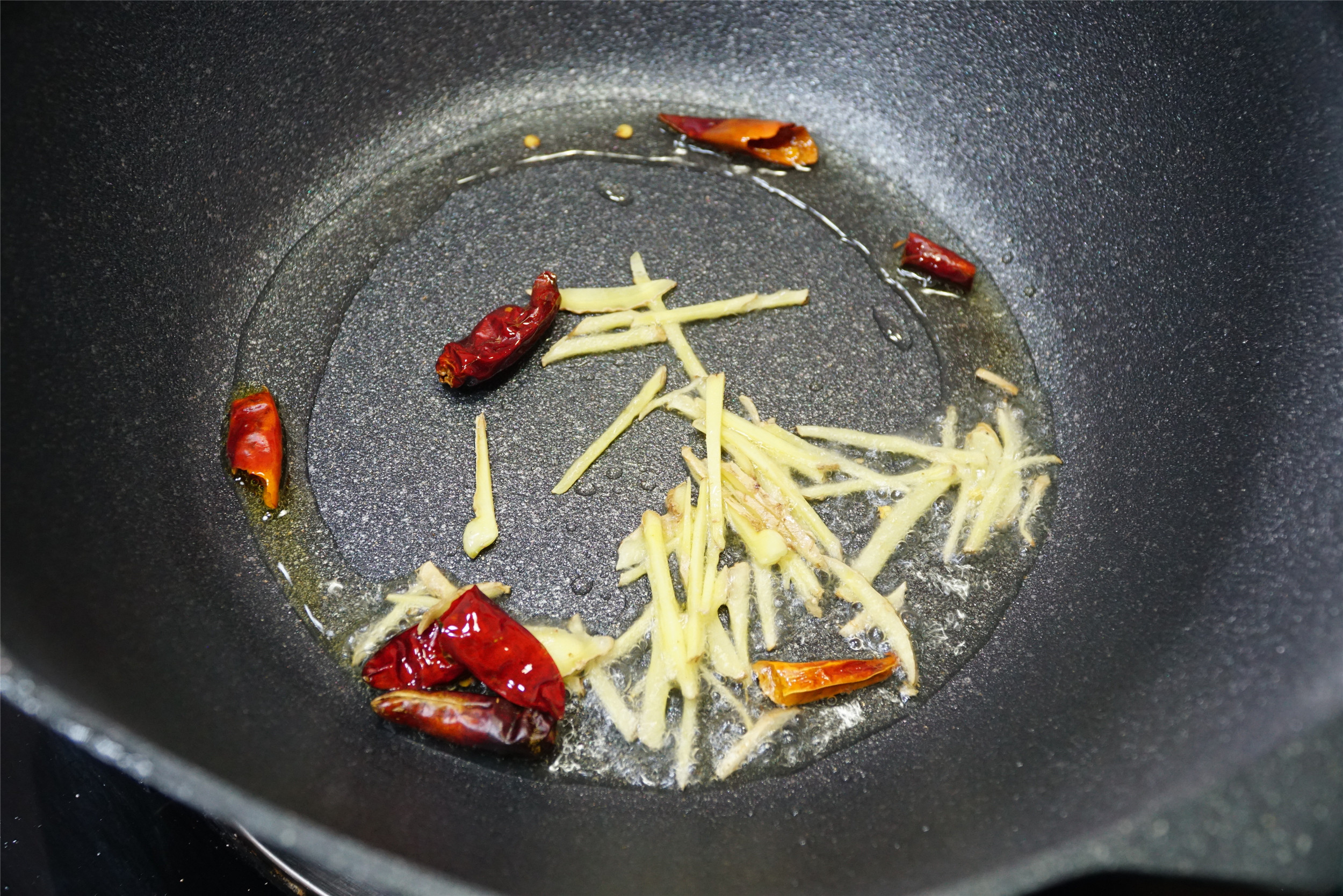 5、锅中再次放入少量的油,加入姜丝和干辣椒炒香,有肉的时候最好都要放一些姜,去腥增香。