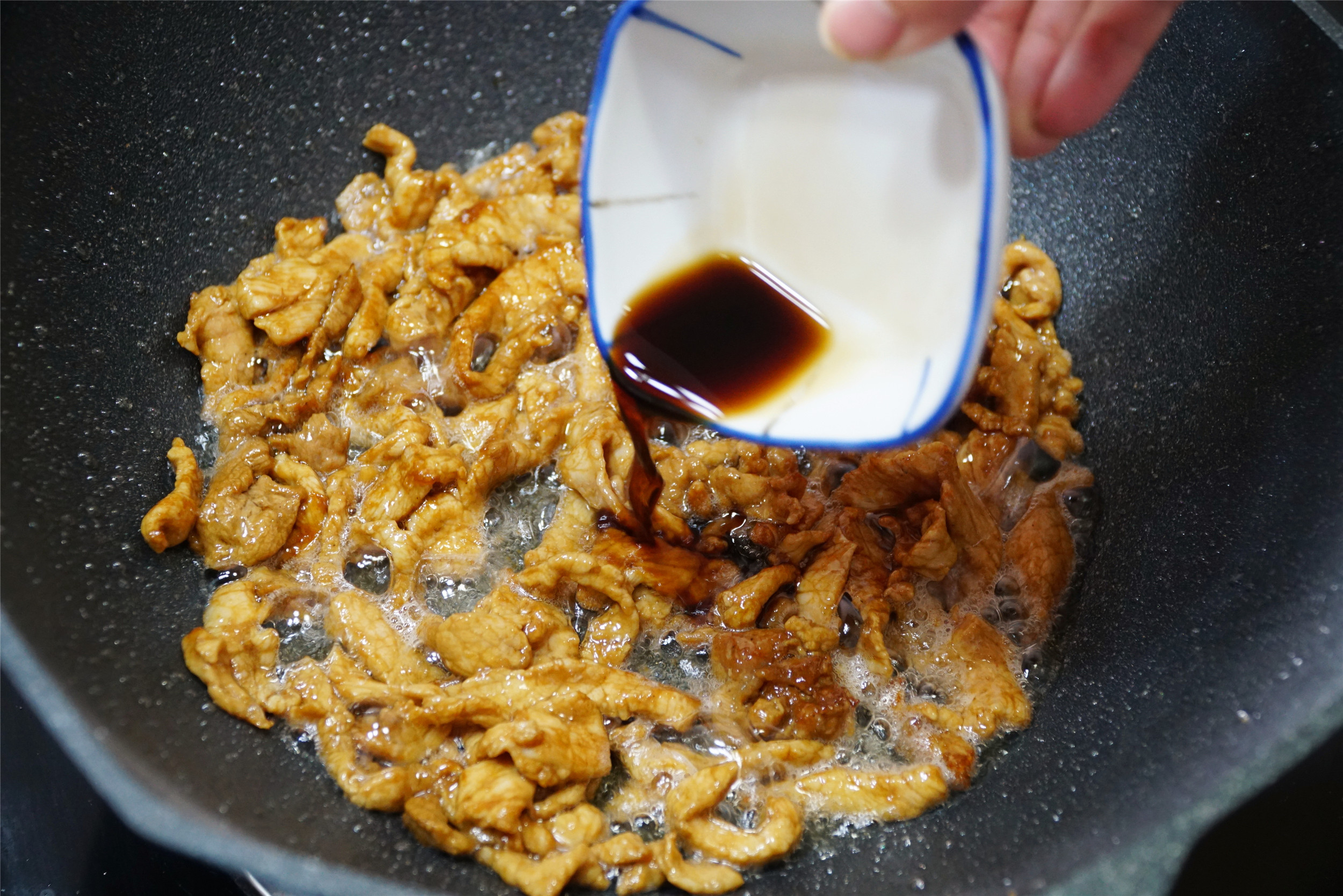 4、锅中适量的油,烧热后加入腌制好的肉丝炒散,需要颜色深一些的可以再加入一些老抽上色。炒熟后盛出备用。