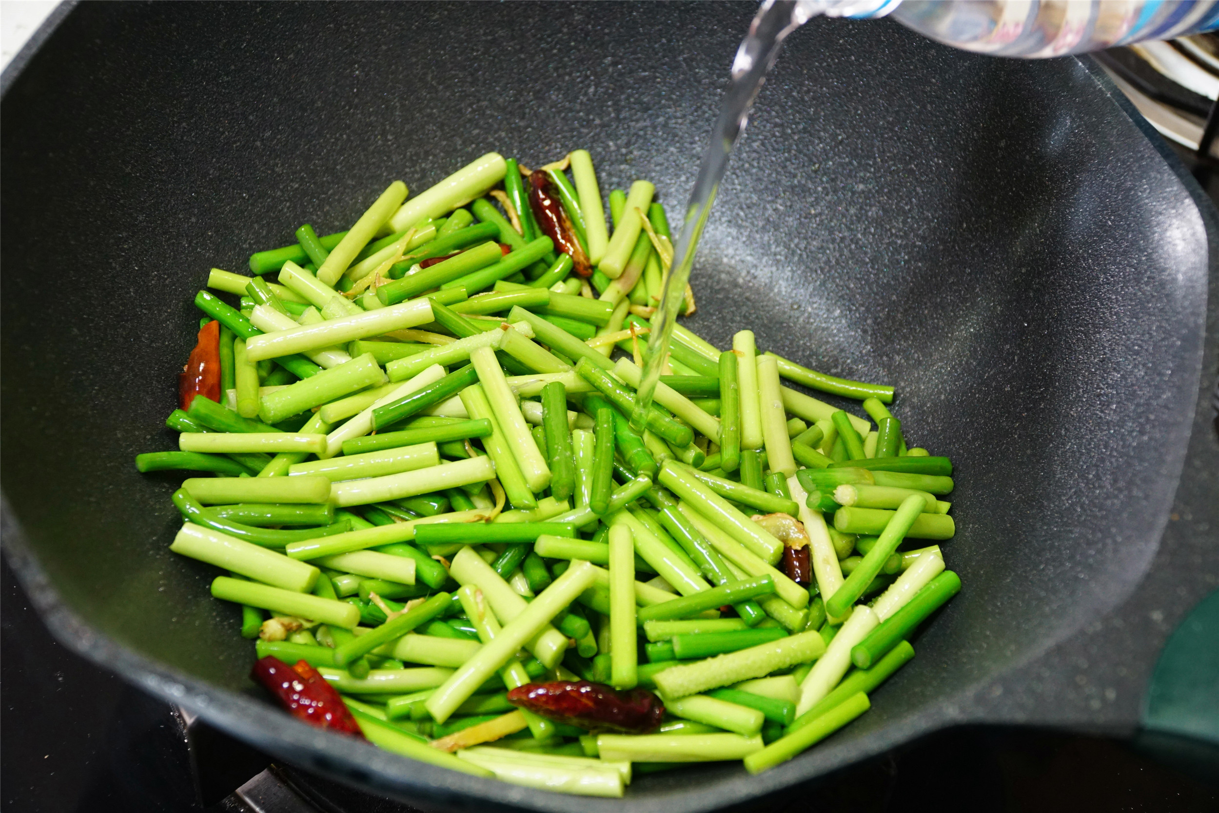 6、放入蒜苔中火翻炒1分钟后,加入大约3勺的水和适量的盐,继续大火翻炒3分钟。