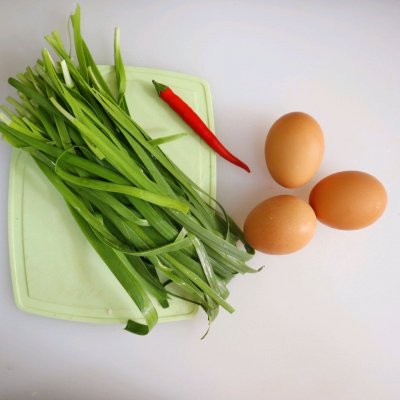 1、准备韭菜一把清洗干净,鸡蛋三个,小米辣一个