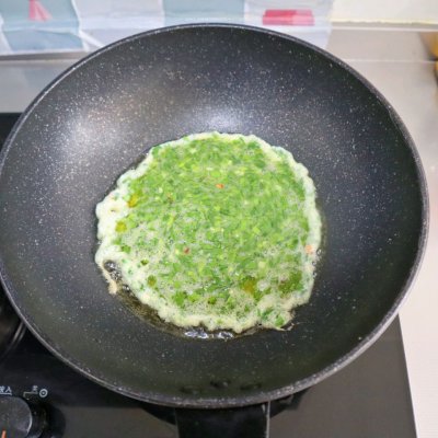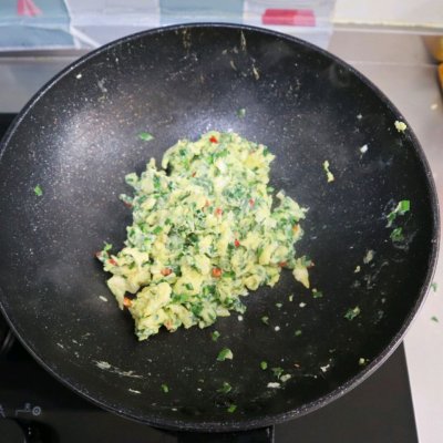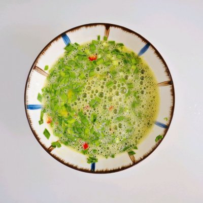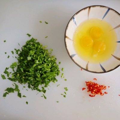 7、比较家常的做法,采用把韭菜切碎混合鸡蛋直接炒,炒出来的韭菜鸡蛋容易咀嚼,不出水,清香不油腻