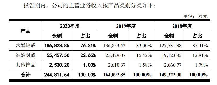 从销售数据看,消费者也很吃这一套。2018-2020年,公司实现营业收入分别为15亿元、16.65亿元、24.64亿元。其中,求婚钻戒的营收占总营收比重为85.41%、83.00%和76.31%,远高于结婚对戒和其他饰品。