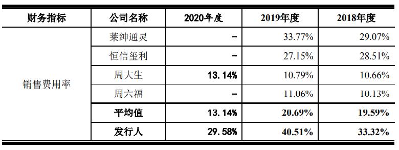2018-2020年,迪阿股份自营门店数量分别为250 家、302家及353家。门店数量不断增长的同时,其销售费用也不断攀升。报告期内,公司销售费用率占比分别为33.32%、40.51%、29.58%,相比同行业19.59%、20.69%、13.14%的费用率平均值,高出不止一倍。