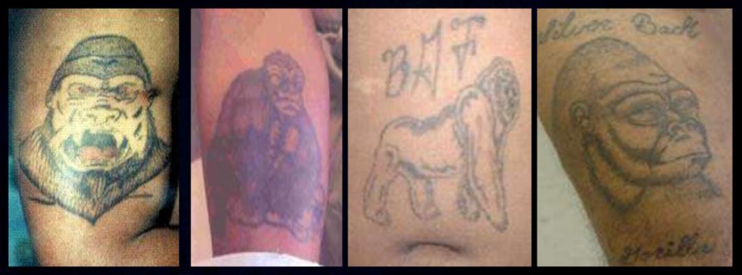 所以你能看到“黑色游击家族”的代表纹身以大猩猩、西方龙,或者缩写的BGF字母为主。