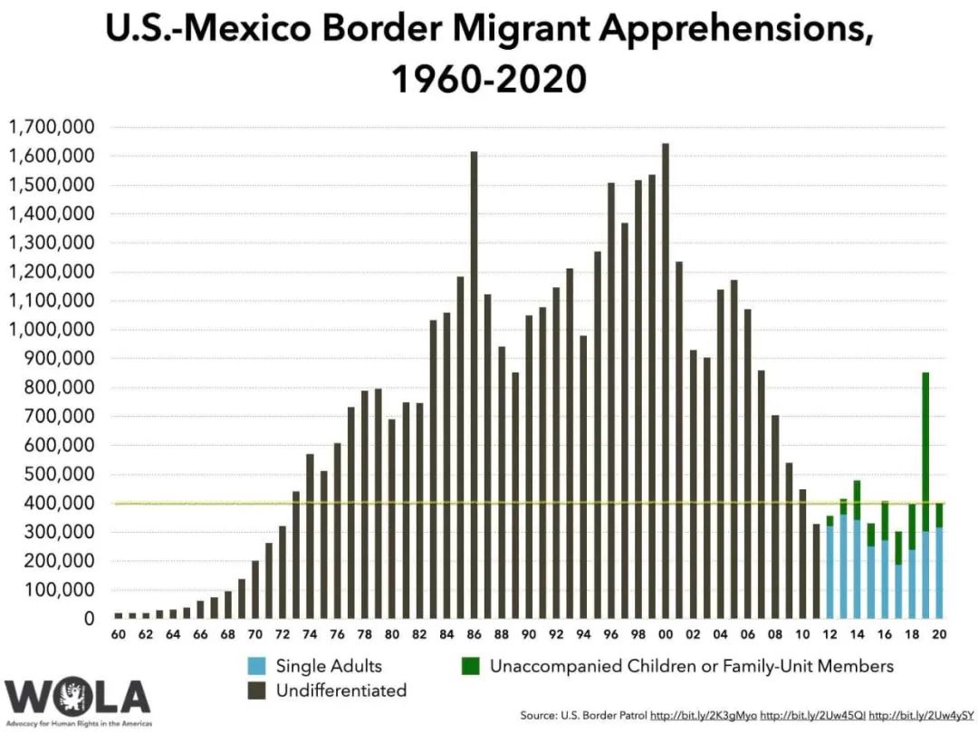 ·美国边境管理局统计的1960~2020年偷渡者数量
