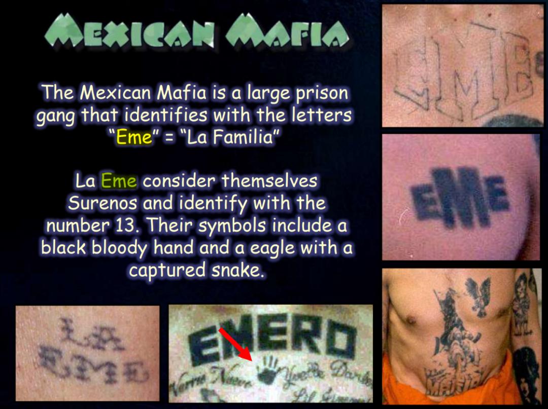 “EME”翻译成英语就是字母“M”,象征着Mexican(墨西哥人)。“MM”和“M13”则都是“Mexican Mafia”的缩写。