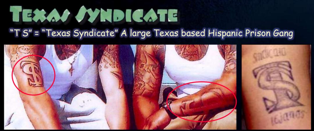 70年代在德州创立的Texas Syndicate帮派,其纹身特点是缩写字母“T”“S”。TS同样为墨西哥帮派,其内部结构十分严密,类似军队一样设立了各类军衔以象征帮派地位。
