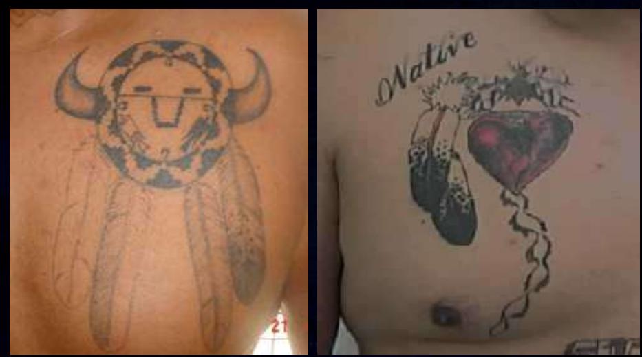 比如来自印第安保留地的印第安帮派成员会纹羽毛、酋长头盔。