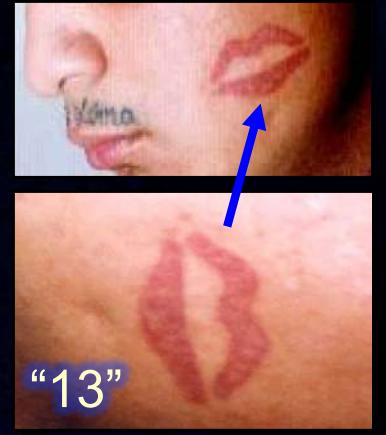 将这个“嘴唇”顺时针旋转250°左右,就会发现是数字“13”,只要是监狱里的墨西哥帮派,纹身都有13这个数字。
