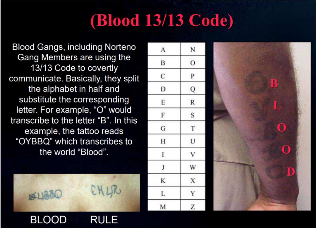 而更加进阶一点的加密纹身,莫过于“血帮”的“Blood 13 code”;这类纹身则是像特工暗号一样,一般人无法辨别。