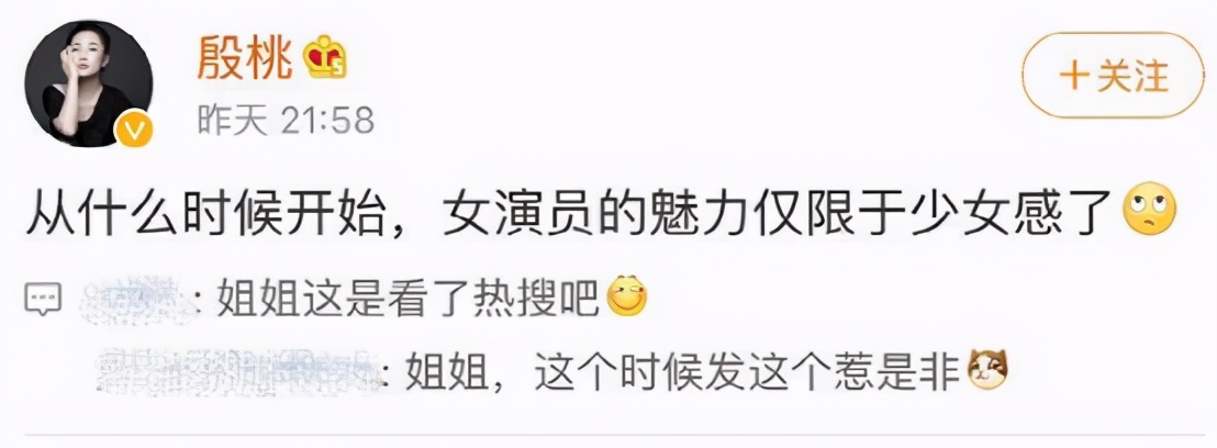 2019年9月,针对影视圈女演员清一色追求少女感的现象,殷桃发文称:“从什么时候开始,女演员的魅力仅限于少女感了?”