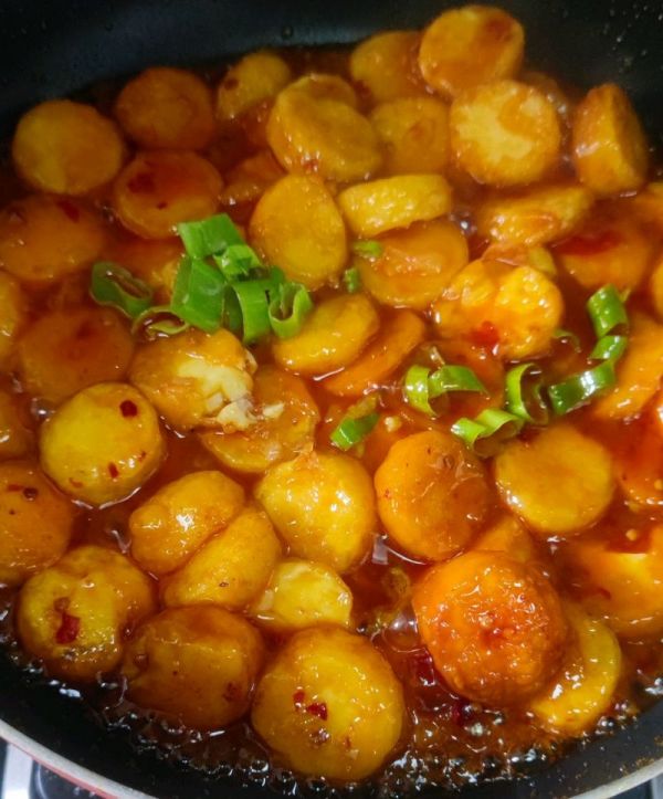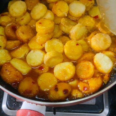 2、起锅放油,油稍微多点,两面煎至酥脆,盛出备用。