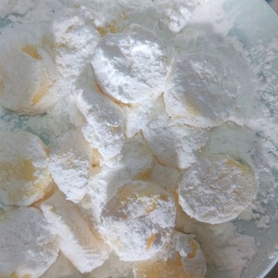1、日本豆腐带包装从中间一切两半,然后挤出来切片,裹一层玉米淀粉。