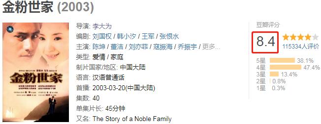 该剧播出后,好评一片,直到现在,《金粉世家》在网上的评分高达8.4分,85%的观众给出了4星以上的好评。