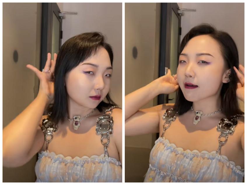 视频中令人注意到的是,辣目洋子穿着抹胸的吊带装而衣服的吊带是铁环做成的看起来十分地别致,搭配上辣目洋子精心准备的妆容,看起来御姐十足。