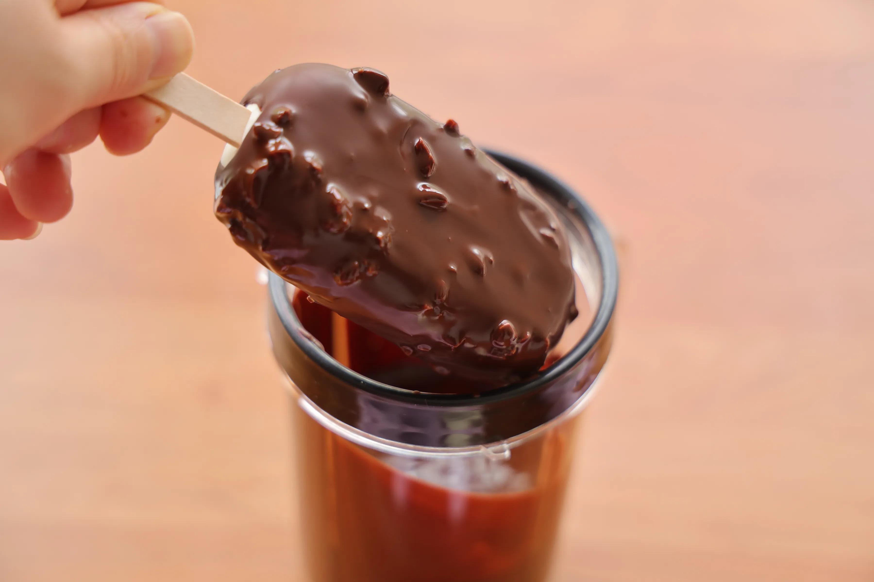9、再加入一把坚果碎进去,倒在一个深一点的杯子里,把冷冻好的雪糕放进去裹上一层巧克力,慢慢等着凝固就可以了;