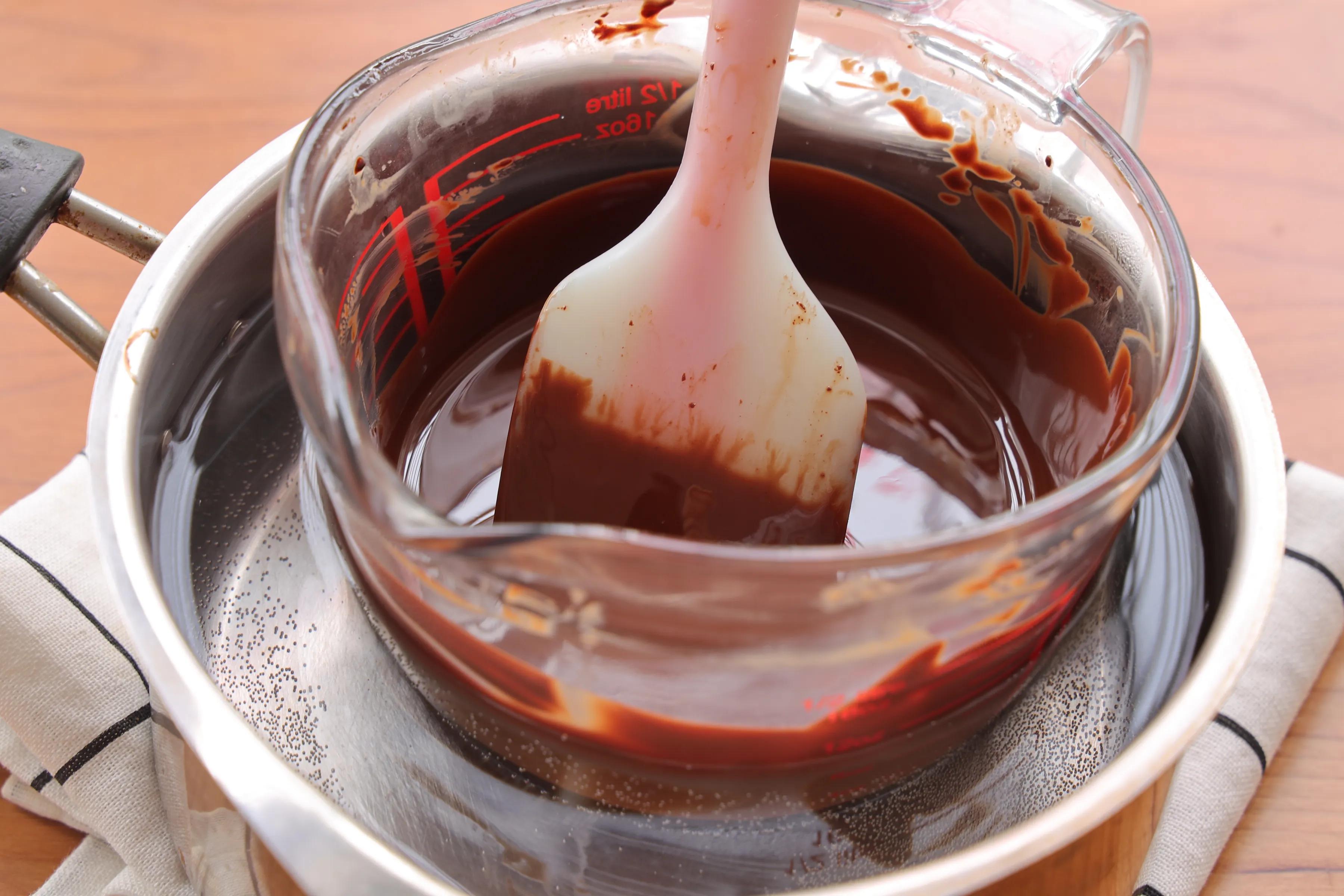 8、75%的黑巧克力加入椰子油,用温水隔水融化。(水温40度左右)