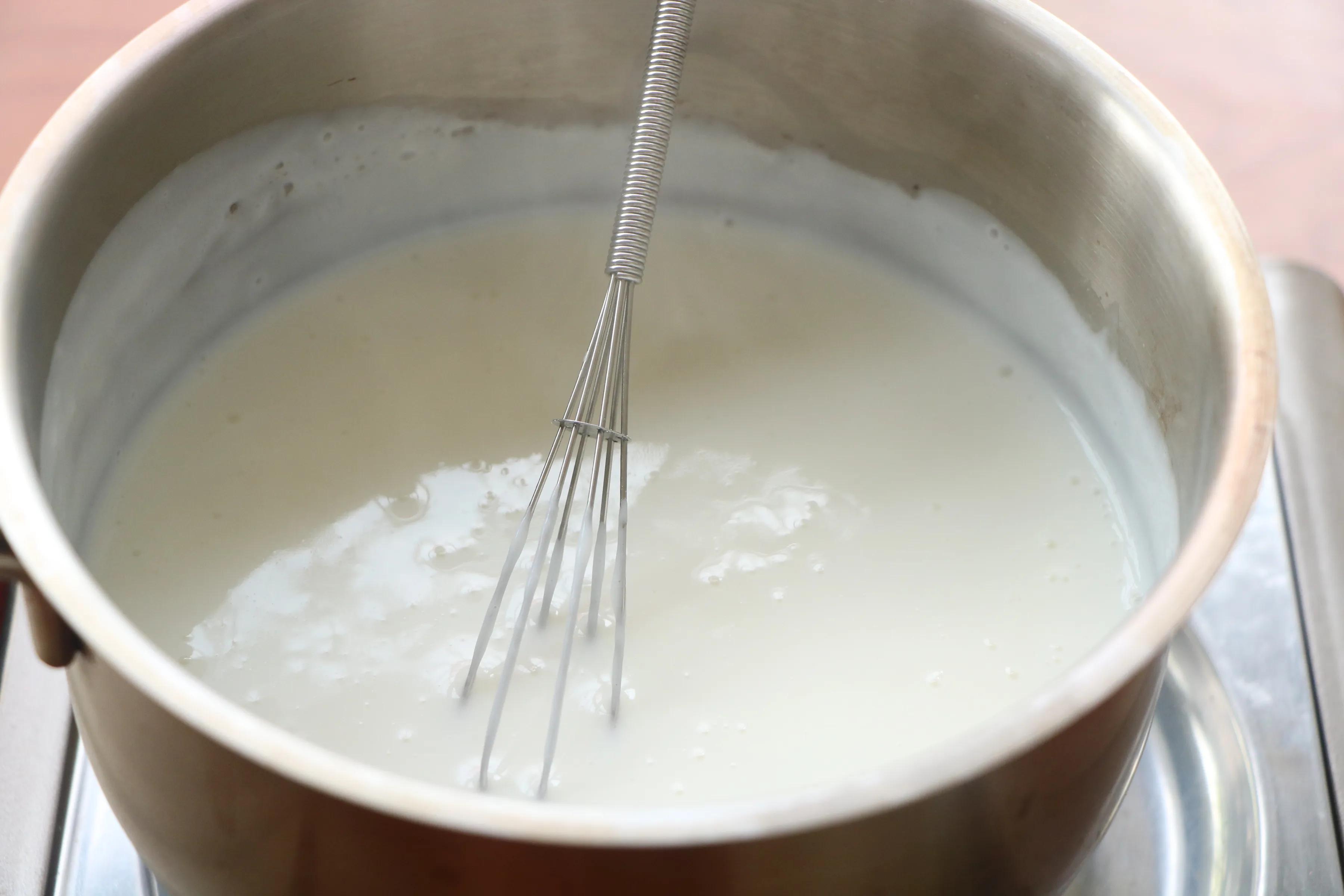 2、牛奶倒在奶锅里,把糯米糊也加进去,搅拌均匀,开小火一边煮一边搅拌,煮至粘稠的状态即可;