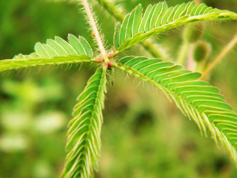 2回羽状复叶有羽片2对,指状排列在总叶柄顶端,羽片有小叶10-20对,小叶片条状长圆形,长10毫米左右,边缘有刚毛;