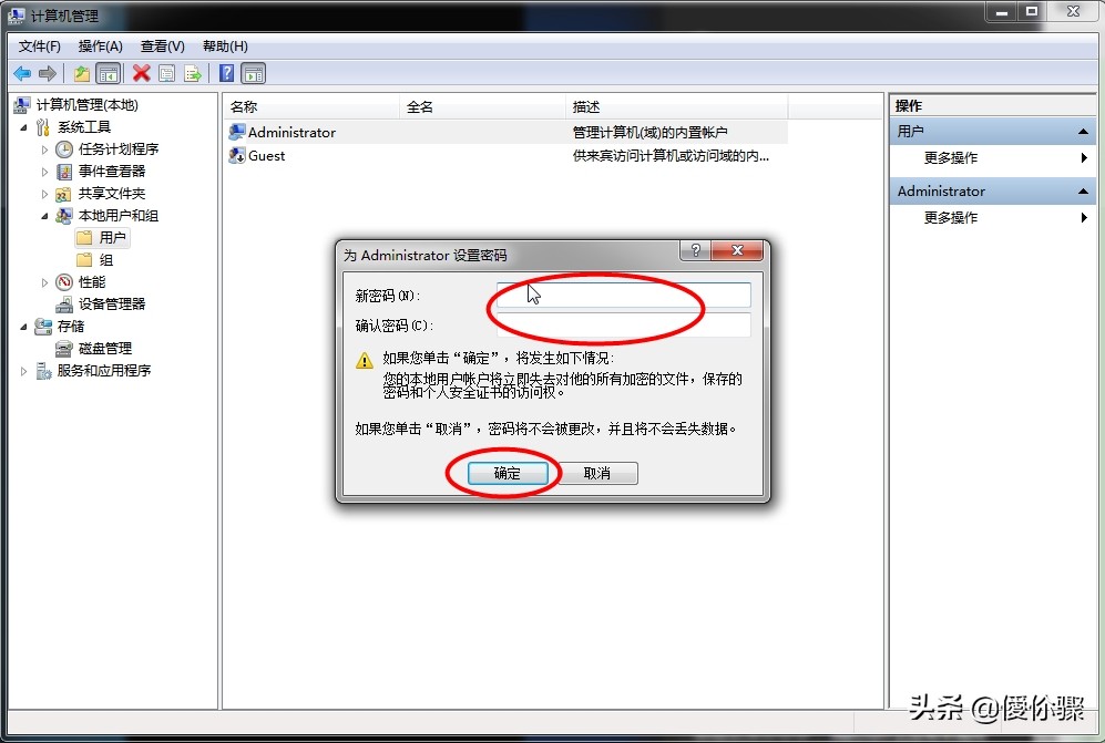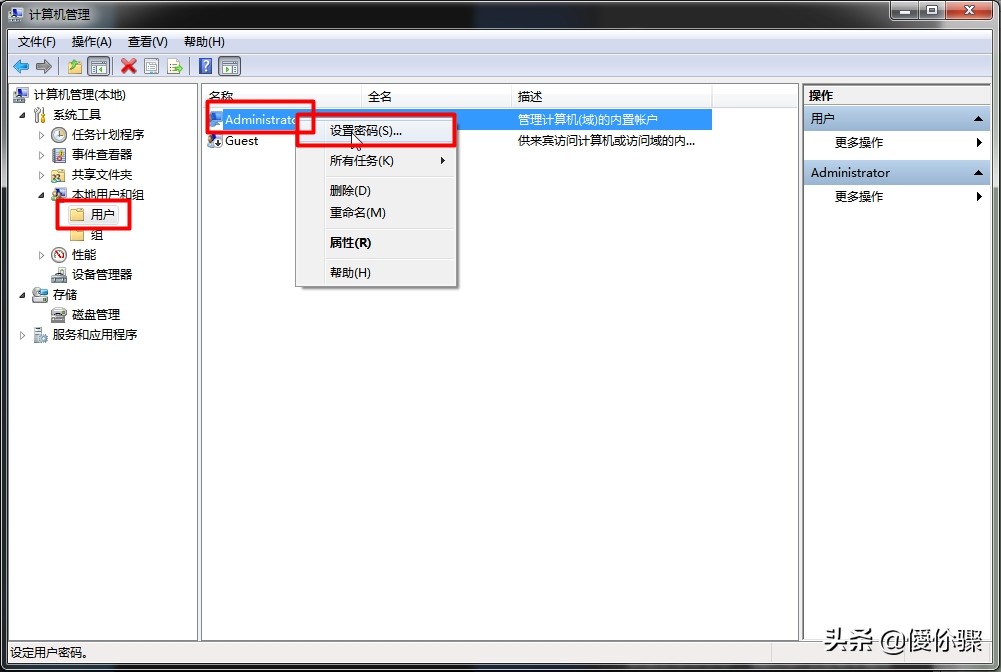 单击完“用户”在右侧找到“Administrator”,右击选择“设置密码”单击,在弹出“为Administrator设置密码”选择“继续”即可;如图所示: