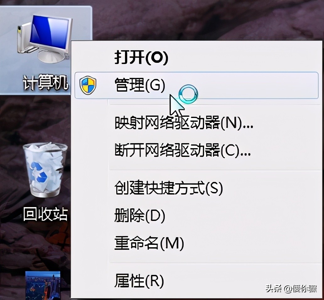 首先,打开电脑在桌面上找到“计算机”选中右击鼠标,在弹出的菜单栏中选择“管理”即可;如图所示: