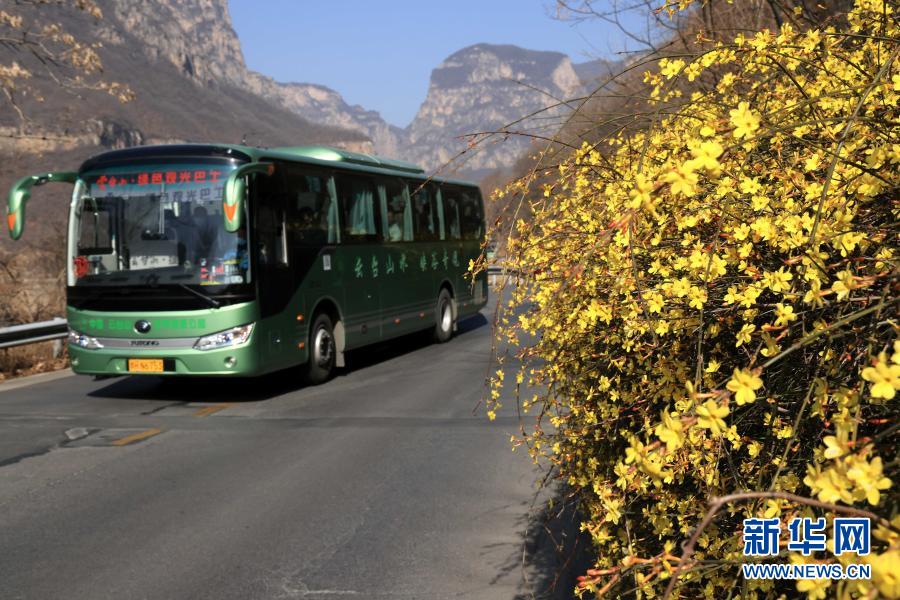 2月16日,一辆旅游大巴行驶在云台山风景区。