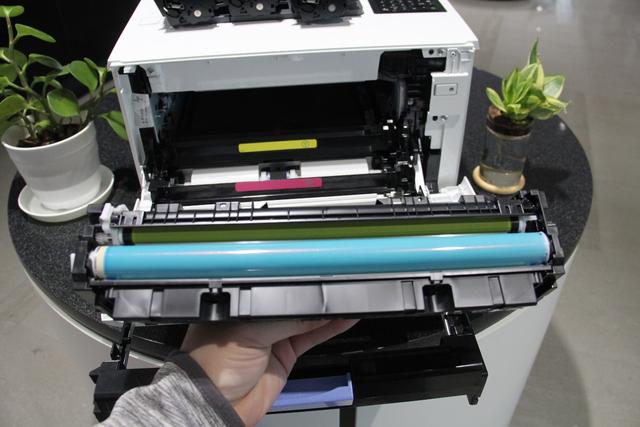 打开惠普M455dn机身前盖,拽动蓝色把手解锁后,我们可以清晰的看到该产品使用的耗材横向依次整齐排列。