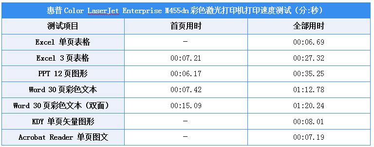 从测试成绩来看,惠普M455dn的输出速度可以满足大多数企业用户对于彩色打印的需求。