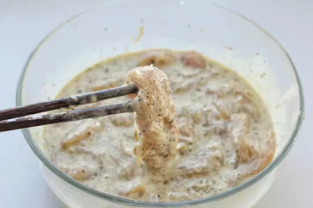 2、腌制时加入两勺盐,两勺鸡精味精,加入20克的十三香,少许的生抽老抽,主要用来调颜色,接着咱们加入100克的玉米淀粉,200克的地瓜淀粉,玉米淀粉能让酥肉更加金黄酥脆,地瓜淀粉主要让酥肉不回软,接着加入适量清水,将所有淀粉搅匀,均匀的挂在肉上即可,另外腌制的时候,也不要放鸡蛋,否则酥肉接下来咱们开始上火制作。