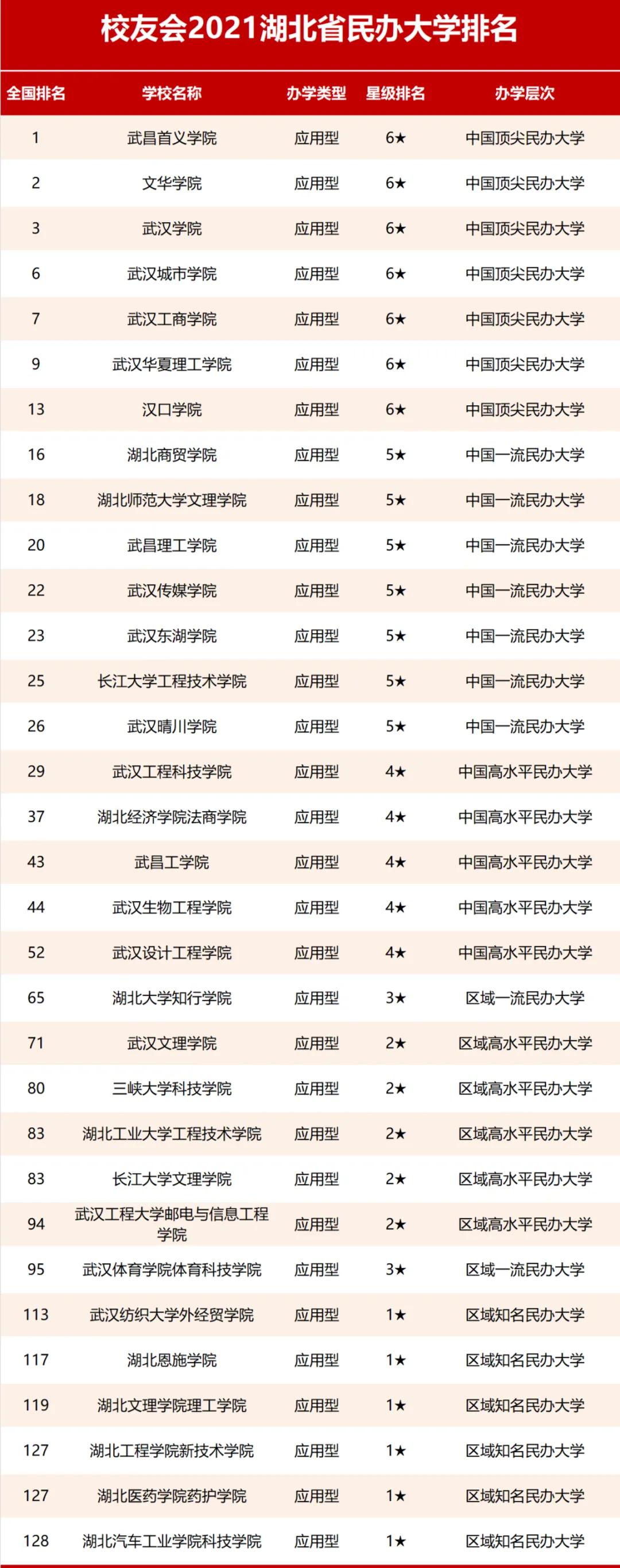 这还有湖北民办高校的排名。武昌首义学院、文华学院、武汉学院排在前三位。排在全国第一位的武昌首义学院,其前身是华中科技大学武昌分校,于2015年独立出来。