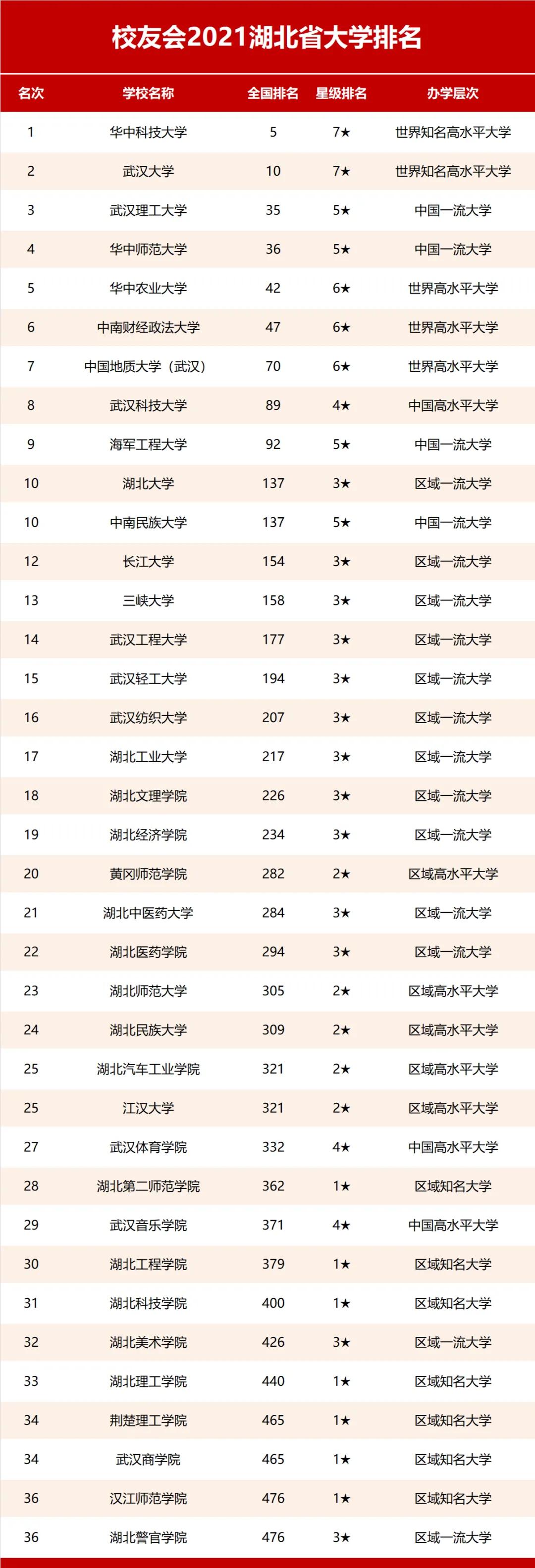 和武书连版的相比,“校友会2021湖北省大学排名”除了加入了两所军警院校外,对其他高校的排名只是稍有不同。