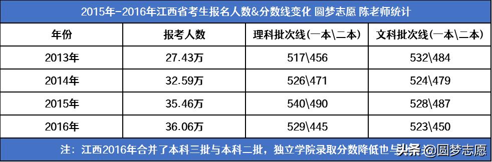 2)不考虑多项变量逐年对比录取分数并不科学,而本来江西的考生数自2015年开始就增速放缓,并且2016年的本科各批次线较2015年也有大幅下降;