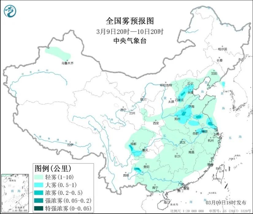 另外,今天夜间至明天上午,华北中部,黄淮北部,江淮东部等地有大雾天气,也要注意防范哦~