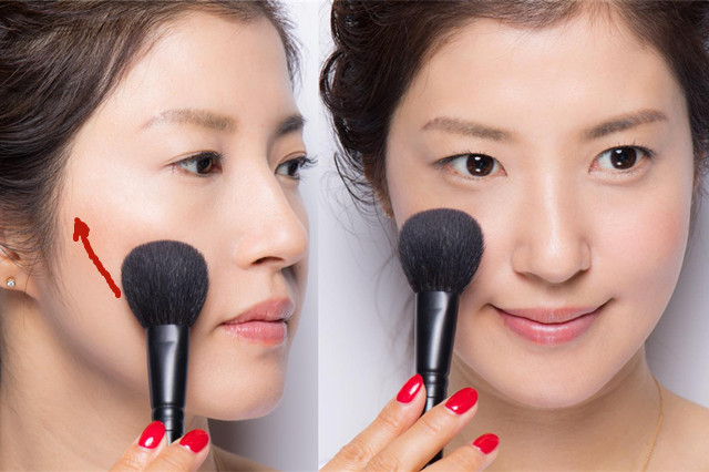 1、在颧骨下刷上玫瑰棕色,对于调整脸部长度的情况,重点不是使角度过大,而应沿颧骨以柔和的角度刷颜色。