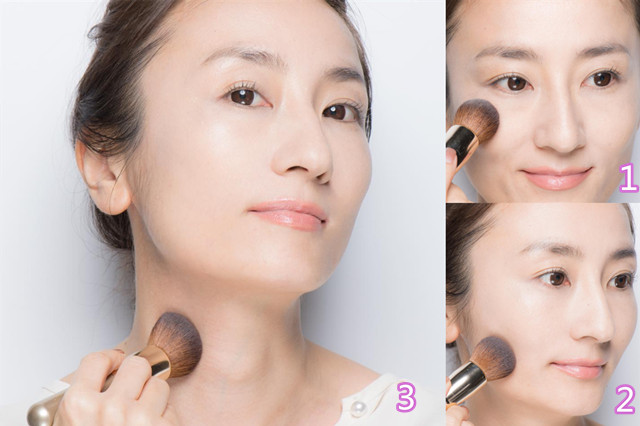 1、在脸部内侧,轻轻将刷子的尖端放在皮肤上,并在上面刷上“糖”粉。