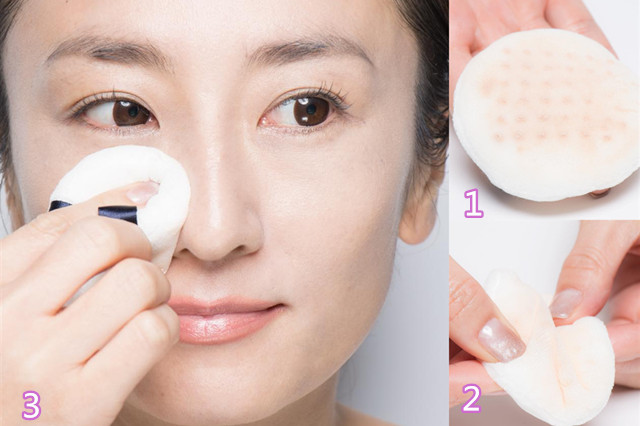 1、将沾有化妆水的化妆棉放在脸颊上,手法是:先按几十秒,使它渗入皮肤,然后将化妆棉向上轻轻移动,然后轻轻擦拭掉死皮细胞,使之光滑。