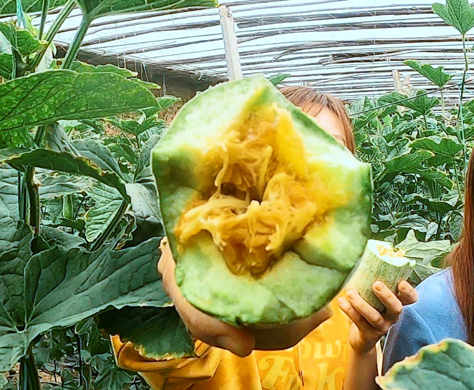 豪爽的瓜农大哥领着我们进了温暖的大棚,一道塑料门帘把倒春寒拒之门外,留给羊角蜜的只有一片暖洋洋的生长空间。“随便摘,都能吃!”大哥大手一挥,那一刻,整个大棚仿佛被我承包了。想问大哥怎么判断什么样的羊角蜜是最甜的,大哥果断摇了摇头冲着我说:“都甜,我这一棚一万多斤瓜保证个个都甜!”他骄傲的扬起眉毛,直接上手从藤上掐下一个一头绿得发黑,另一头冒着莹莹翠绿的羊角蜜递给我,“擦擦直接吃就行,都干净的!”我伸手接过大哥的热情,擦了擦羊角蜜表面一层细密的用来防止虫害的绒毛。