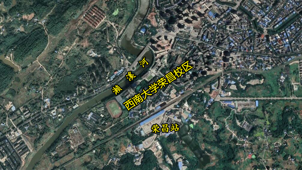 濑溪河是荣昌区最大的河流,它穿过荣昌城区。成渝铁路是荣昌第一条铁路,在城区设置有荣昌火车站。而西南大学荣昌校区,就位于濑溪河与荣昌火车站的夹角之中。而且它的方位和它的名字很符合——就位于整个荣昌城区的西南角落里。