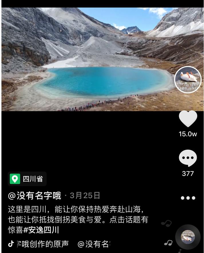 3月25日至4月14日,由四川省文旅厅联合四川广播电视台举办的“安逸四川”短视频征集活动在抖音平台火热开展。活动以安逸四川为征集话题,通过“到底什么是安逸四川”的创作主题鼓励广大用户用镜头去记录、表达自己心中的安逸四川。