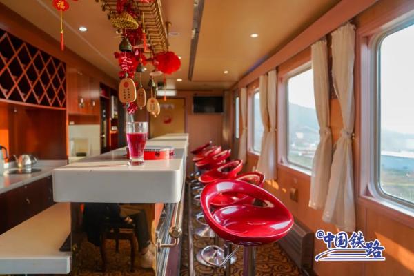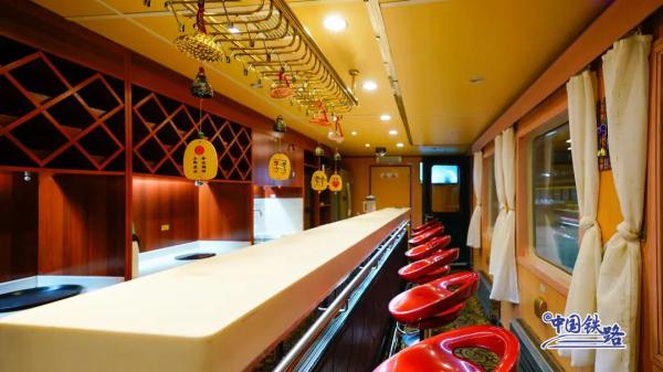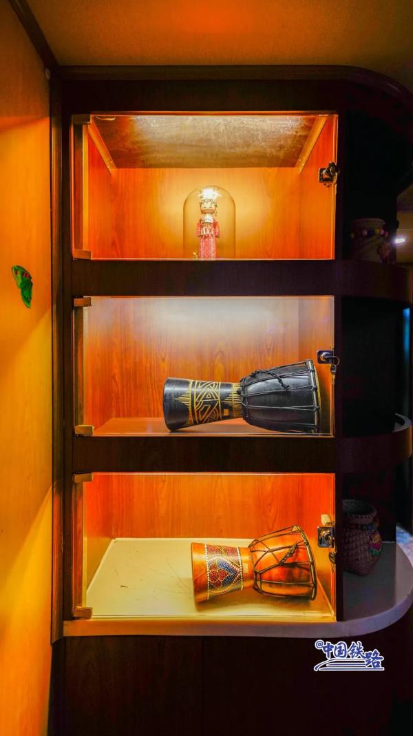 吃饱喝足,可以去列车网红酒吧车一探究竟。在这里,旅客不仅可以欣赏少数民族歌舞表演,还可以自主点歌唱K、弹钢琴、打手鼓,或参与列车互动问答,还有机会获得金花乘务员精心设计制作的民族玩偶、旅行便笺、布艺手袋、舒缓眼罩等。