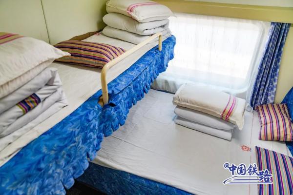 硬卧车厢,被子和枕头上都有彝族特色刺绣。