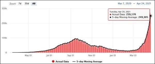 印度2020年3月-2021年4月单日新增确诊病例数走势图(图源:印媒)